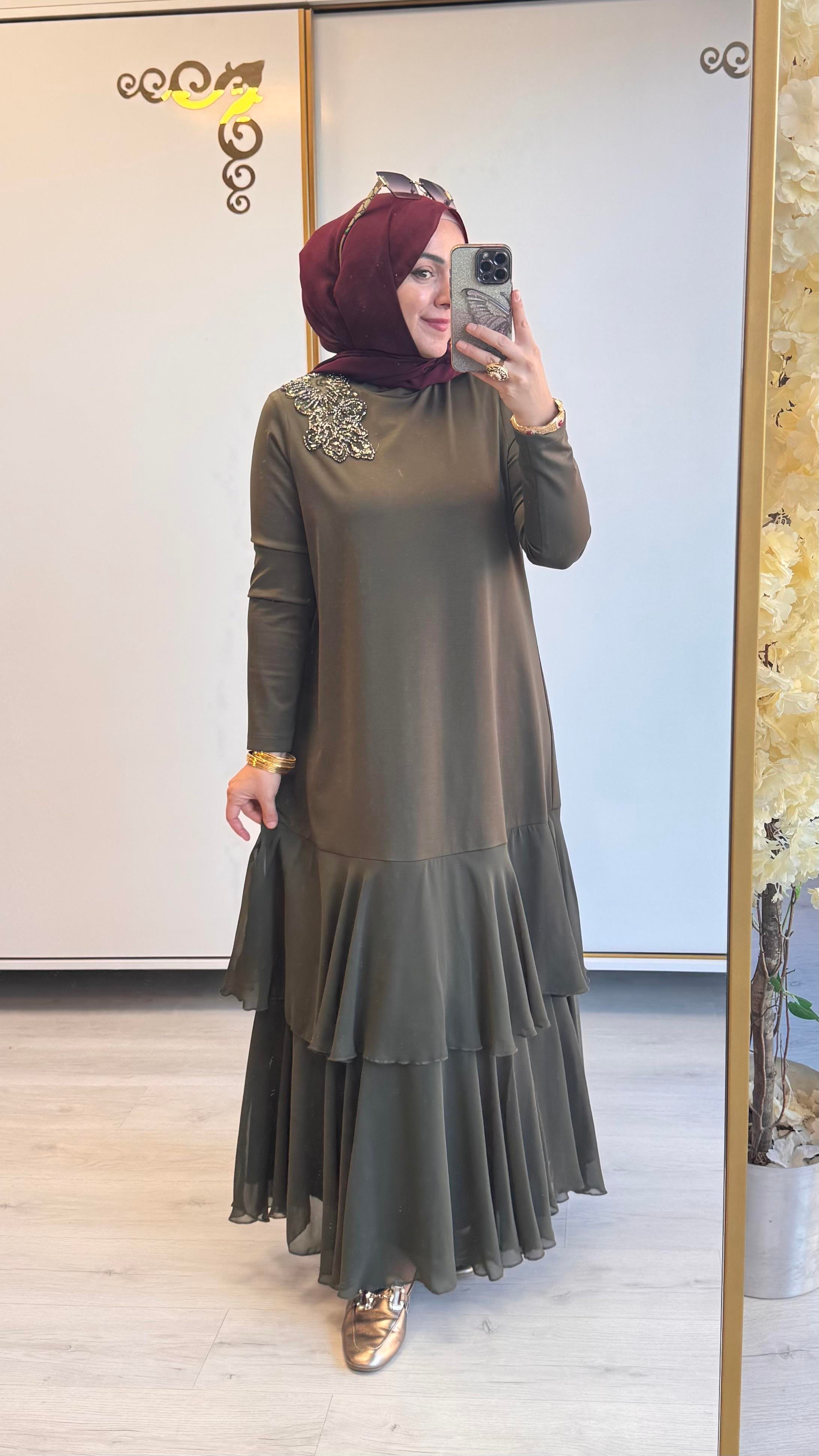 Nurcan Çetin Şifon Detaylı Elbise Haki