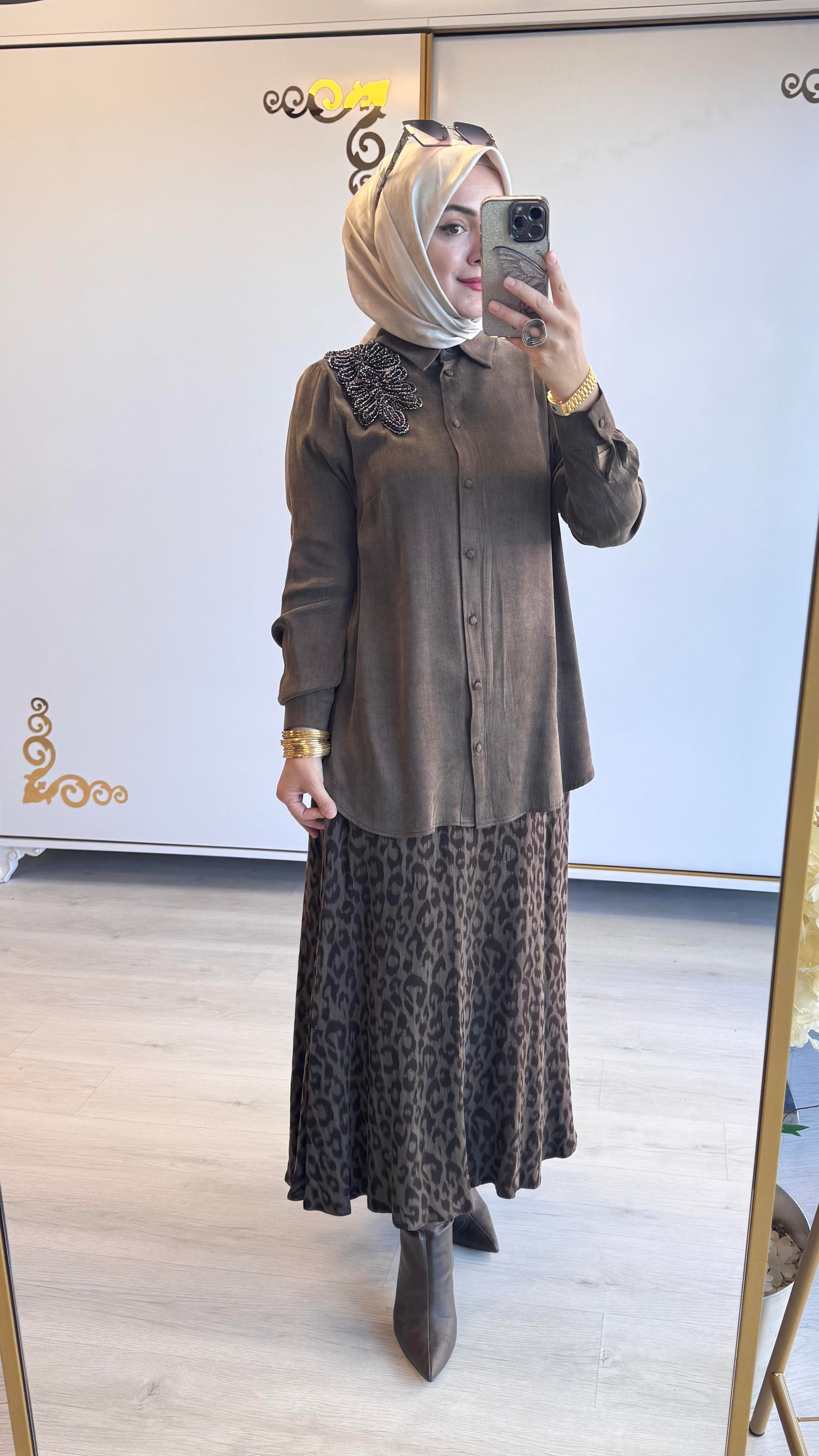 Kalıp: Rahat Kumaş Tipi: Qupra İpek Boy: Uzun Meteryal: Tensel Yaka Tipi: Gömlek Yaka Kol Tipi: Standart Kol Kol Boyu: Uzun Desen: Nakışlı/İşlemeli Alt-Üsttakım: Tunik-Etek Etek: Yandan fermuarlı, arkası lastikli Materyal Bileşeni: %100Tensel